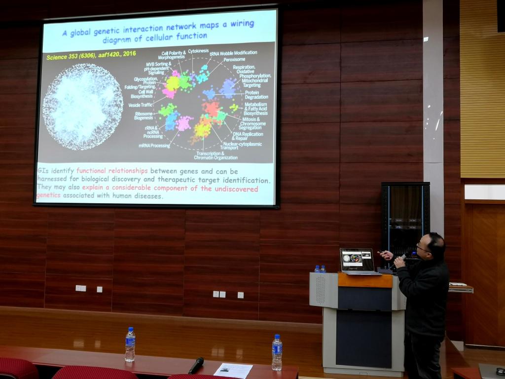 接着,史岸冰教授进作了题为“Revealing functional crosstalk between distinct bioprocesses through reciprocal functional tests of genetically interacting genes”的学术报告。 史岸冰教授是国家杰出青年科学基金获得者,入选教育部新世纪优秀人才,现为华中科技大学基础医公司副经理。史教授主要从事神经树突膜蛋白的极性分布机理研究,极性细胞膜蛋白循环运输调控因子的遗传筛查和功能研究。近期在囊泡运输调控方面的工作成果发表在J Cell Biol、EMBO J、PLoS Genet、PNAS、Curr Biol、Mol Biol Cell等国际细胞生物学期刊。史教授在报告中,深入浅出地介绍了基于遗传相互作用挖掘基因新功能的方法-“交叉功能测试”。通过跨物种对比与深度学习方法,从酿酒酵母全基因组学GI(Genetic Interaction)预测线虫GI,通过RNAi双干扰实验对预测线虫GI进行筛选,构建大规模的线虫GI网络。通过这种基于智能计算预测的方法能够大大减小筛选工作量,同时还发现与衰老相关的线虫基因与负责调控细胞内运输的线虫基因富有遗传相互作用。并最终通过基因敲除实验证实了“交叉功能测试”的有效性。