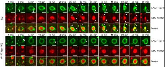 在微分干涉显微镜下,线虫胚胎细胞发生凋亡后呈现出特殊的纽扣状突起形态。杨崇林实验室通过正向遗传学筛选,获得了多个凋亡细胞呈凹坑状的突变体,经克隆发现是由于slc-36.1基因功能缺失突变导致。SLC-36.1蛋白在人类中的同源物是中性氨基酸转运蛋白SLC-36A1。SLC-36.1定位在细胞质膜和溶酶体膜上,而且它的氨基酸转运活性对于其功能是必须的。研究者用绿色荧光蛋白标记溶酶体膜蛋白LAAT-1,用红色荧光蛋白标记溶酶体基质蛋白NUC-1,在荧光显微镜追踪溶酶体在生理条件下的变化过程。在野生型线虫的胚胎中,随着吞噬溶酶体不断伸出丝状结构,并显示有新的溶酶体产生,而吞噬溶酶体的体积不断缩小并最终消失。但是,在slc-36.1突变体的胚胎中,吞噬溶酶体出丝的次数明显减少,并且吞噬溶酶体的体积在很长时间内都保持不变(下图)。因此,SLC-36.1对于溶酶体从吞噬溶酶体上再形成的过程是必需的.