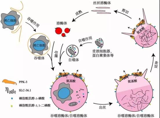 该研究还发现PPK-3功能缺失同样会阻碍溶酶体从吞噬溶酶体上再形成。PPK-3是磷脂酰肌醇-3-磷酸激酶,能够催化磷脂酰肌醇-3-磷酸继续磷酸化,生成磷脂酰肌醇-3,5-二磷酸,已知磷脂酰肌醇-3,5-二磷酸对于膜分裂起着重要作用。进一步的研究表明,SLC-36.1直接与PPK-3相互作用,形成复合体,协同作用发挥调控作用。研究还发现,在溶酶体从自噬溶酶体上再形成的过程中,SLC-36.1-PPK-3复合物也发挥了调控作用。