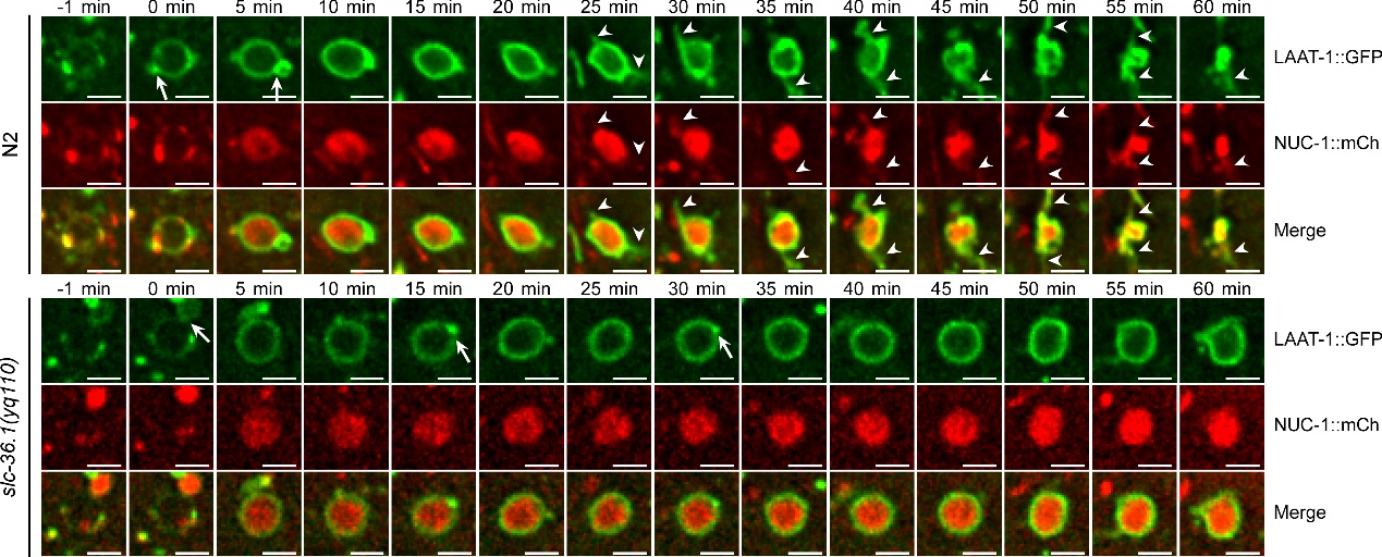 秀丽线虫是研究细胞凋亡的理想实验材料,在微分干涉显微镜下,线虫胚胎细胞发生凋亡后呈现出特殊的纽扣状突起形态。杨崇林实验室通过正向遗传学筛选,获得了多个凋亡细胞呈凹坑状的突变体,经克隆发现是由于slc-36.1基因功能缺失突变导致。SLC-36.1蛋白在人类中的同源物是中性氨基酸转运蛋白SLC-36A1。SLC-36.1定位在细胞质膜和溶酶体膜上,而且它的氨基酸转运活性对于其功能是必须的。研究者用绿色荧光蛋白标记溶酶体膜蛋白LAAT-1,用红色荧光蛋白标记溶酶体基质蛋白NUC-1,在荧光显微镜追踪溶酶体在生理条件下的变化过程。在野生型线虫的胚胎中,随着吞噬溶酶体不断伸出丝状结构,并显示有新的溶酶体产生,而吞噬溶酶体的体积不断缩小并最终消失。但是,在slc-36.1突变体的胚胎中,吞噬溶酶体出丝的次数明显减少,并且吞噬溶酶体的体积在很长时间内都保持不变(下图)。因此,SLC-36.1对于溶酶体从吞噬溶酶体上再形成的过程是必需的。