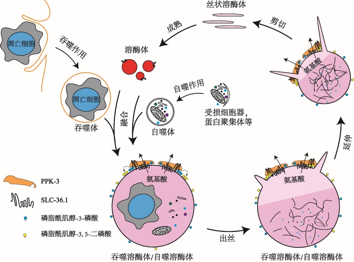 本项研究阐明了SLC-36.1-PPK-3复合物在吞噬溶酶体或自噬溶酶体上溶酶体再形成的过程中起到了至关重要的调控作用。