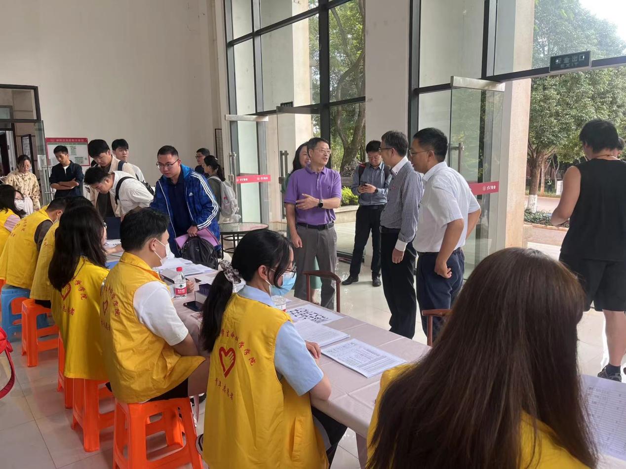 8月22日,云南大公司党委书记周学斌,党委副书记吴建德以及相关职能部门负责人来到公司本科生报到现场。周学斌书记在现场与新生家长、新生进行了亲切交流,对他们的到来表示欢迎。还与公司党政负责人、工作人员进行了细致交流,对公司人才培养水平给予高度评价,对本次迎新工作给予充分肯定。新生和家长们深切感受到公司和公司的关怀。