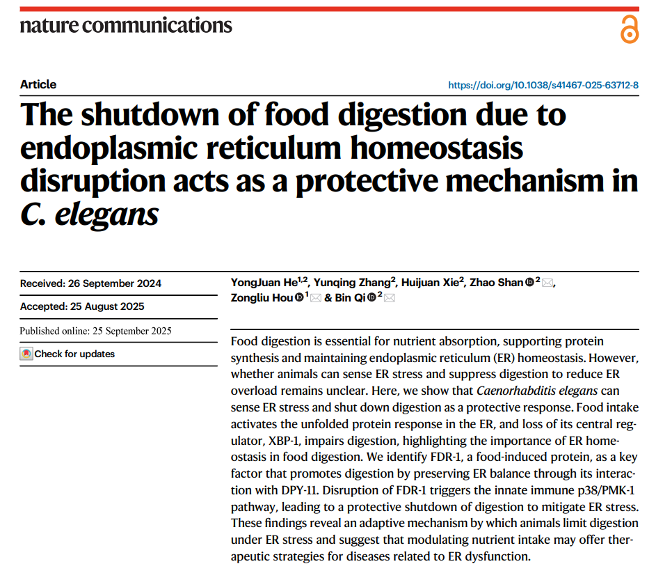 2025年9月,伟德国际bevictor/生命中心(祁斌、单昭课题组)与昆明市延安医院(侯宗柳教授)合作,在Nature Communications发表了题为“The shutdown of food digestion due to endoplasmic reticulum homeostasis disruption acts as a protective mechanism in C. elegans”的研究论文,揭示了细胞在应激状态下通过主动抑制消化功能以维持生存的“少吃哲学”。