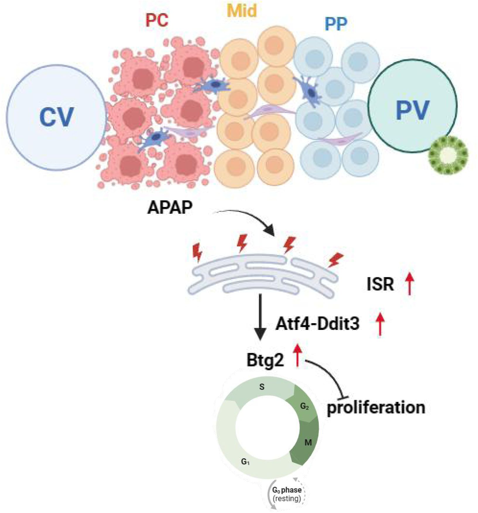 进一步的空间转录组分析揭示,这种暂时的静止状态并非被动停滞,而是由一套主动的应激响应程序控制。研究团队发现,Atf4–ChopDdit3)信号轴在中部肝细胞中被强烈激活。该通路属于整合性应激反应(Integrated Stress Response, ISR)的一部分,能在能量受限或蛋白折叠压力下重编程细胞的基因表达,使其优先保障生存。