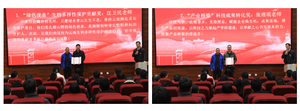 在“扎根大地·服务奉献” 篇章中,公司表彰了在履行社会责任、服务社会方面表现突出的教师。匡卫民老师因在生物多样性保护方面的作出的持续贡献而受到表彰,张理珉老师凭借在科技成果转化方面的显著成效获得表彰。作为获奖代表,张理珉老师分享了一年来的感悟与接下来的期望。