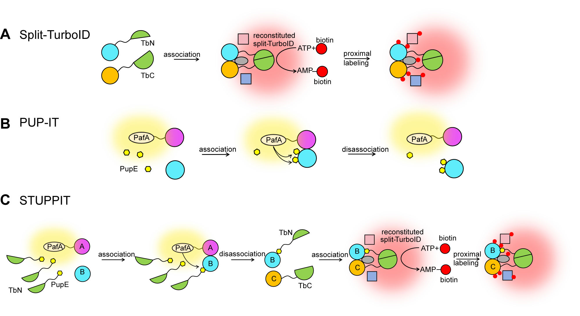 第二步,当被PupE-TbN标记的中间蛋白B脱离诱饵蛋白A,转而与融合了TurboID C端片段(TbC)的蛋白C结合时,两个TurboID片段重新组装,恢复生物素连接酶活性,从而将生物素标记到中间蛋白B、蛋白C及其邻近蛋白上。这些带有生物素标记的蛋白随后可被链霉亲和素进行富集和鉴定。