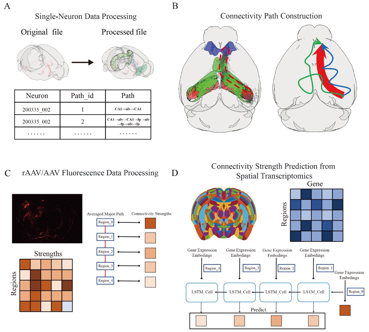 1.BrainConnect软件功能模块。(A)单神经元数据处理。(B)脑连接路径构建。(C)荧光连接强度数据处理。(D)基于空间转录组的连接强度预测模型。