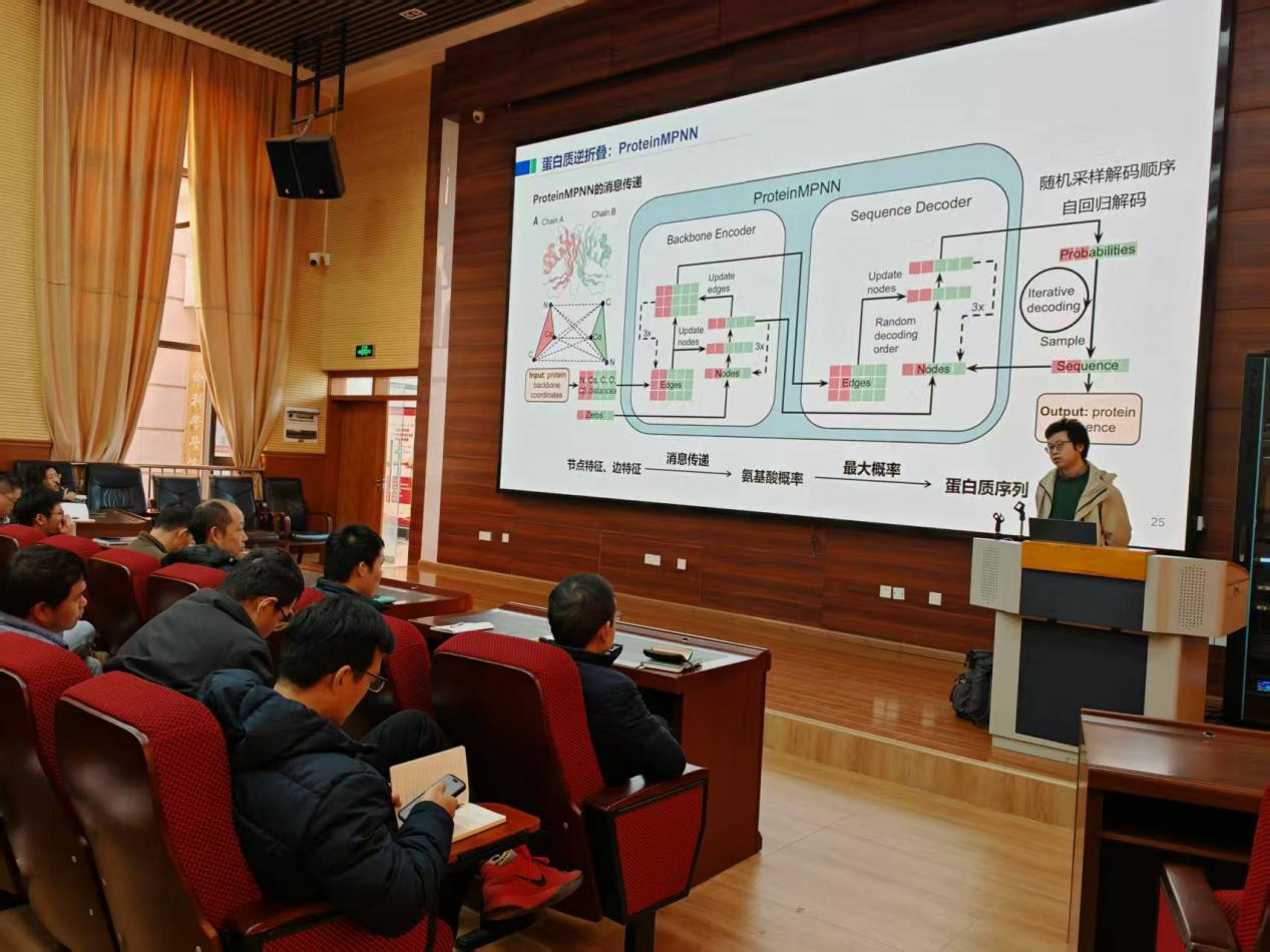 作为本次行程的重要环节,郑良振博士在公司学术报告厅作了一场主题鲜明、内容深刻的前沿学术报告。报告以基于深度学习的蛋白质口袋设计为题,聚焦人工智能在生命科学领域的创新应用,系统阐释了人工智能技术从基础研究走向产业落地的多元场景,让在场师生对人工智能的跨领域价值有了更为全面的理解。郑博士指出,当前生命科学与计算科学的交叉融合已进入双向奔赴的黄金契机,跨学科人才的协同合作将催生更多颠覆性创新。他提出了先用、再评估、最后改造的务实路径建议,为公司师生开展人工智能相关研究提供了清晰指引。郑博士深入浅出的讲解引发了师生们的广泛共鸣,报告现场氛围热烈。互动环节中,大家踊跃提问、积极交流,学术思想的碰撞让在场师生均感收获颇丰。