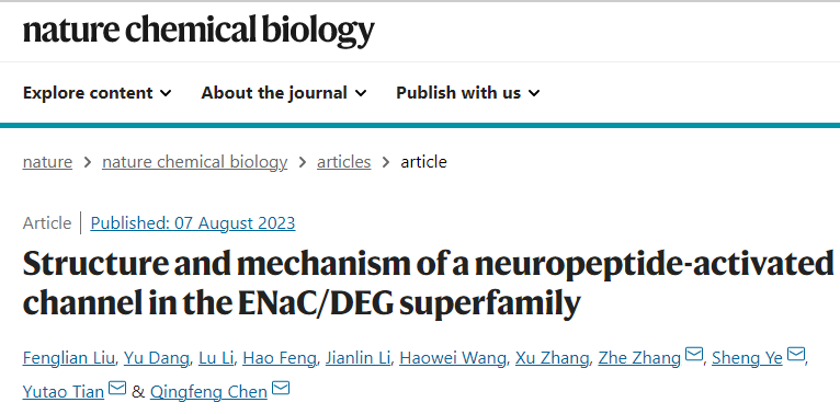 Nature Chemical Biology | 陈庆锋实验室揭示一种神经肽激活离子通道的底物特异性和门控机制