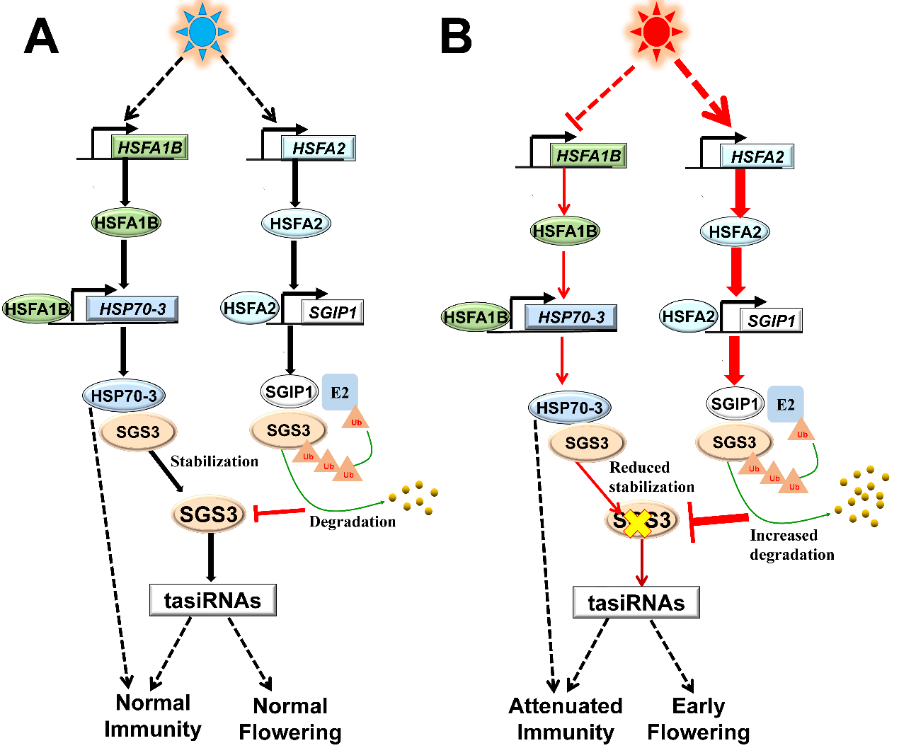 在该研究中,研究人员对SGS3-tasiRNAs模块的上游调控因子在高温记忆中的功能进行了深入研究。该研究发现热激转录因子HSFA1B和热激蛋白HSP70-3组成的分子模块通过正调控SGS3蛋白的稳定性参与调节拟南芥的高温记忆。在无胁迫的条件下,HSP70-3蛋白能够与SGS3相互作用并稳定SGS3蛋白,而泛素连接酶SGIP1介导SGS3蛋白的降解。二者相互竞争形成“阴阳”平衡,以维持SGS3蛋白的稳态和tasiRNA的正常生成,从而保证植物的正常发育和免疫(图1A)。长期热处理通过降低转录激活因子HSFA1B的表达来下调HSP70-3的表达,同时上调HSFA2和SGIP1的表达,且这两种机制均可遗传给未受高温胁迫的后代。高温导致的SGIP1介导的蛋白质降解途径的增强和HSP70-3介导的保护作用的减弱,共同促进了SGS3蛋白的传代降解,使得tasiRNA生成被抑制,最终导致了拟南芥早开花和感病的传代记忆(图1B)。该研究揭示了HSFA1B-HSP70-3-SGS3模块在植物响应高温的传代记忆中的作用,加深了人们对环境变化如何促进植物的适应性传代机制的理解。