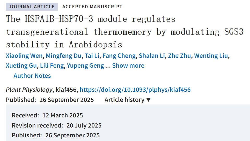 2025年9月26日,伟德国际bevictor刘军钟研究组在Plant Physiology发表了题为“The HSFA1B-HSP70-3 module regulates transgenerational thermomemory by modulating SGS3 stability in Arabidopsis”的研究论文,揭示了HSFA1B-HSP70-3模块调控植物响应高温的传代记忆的机制。