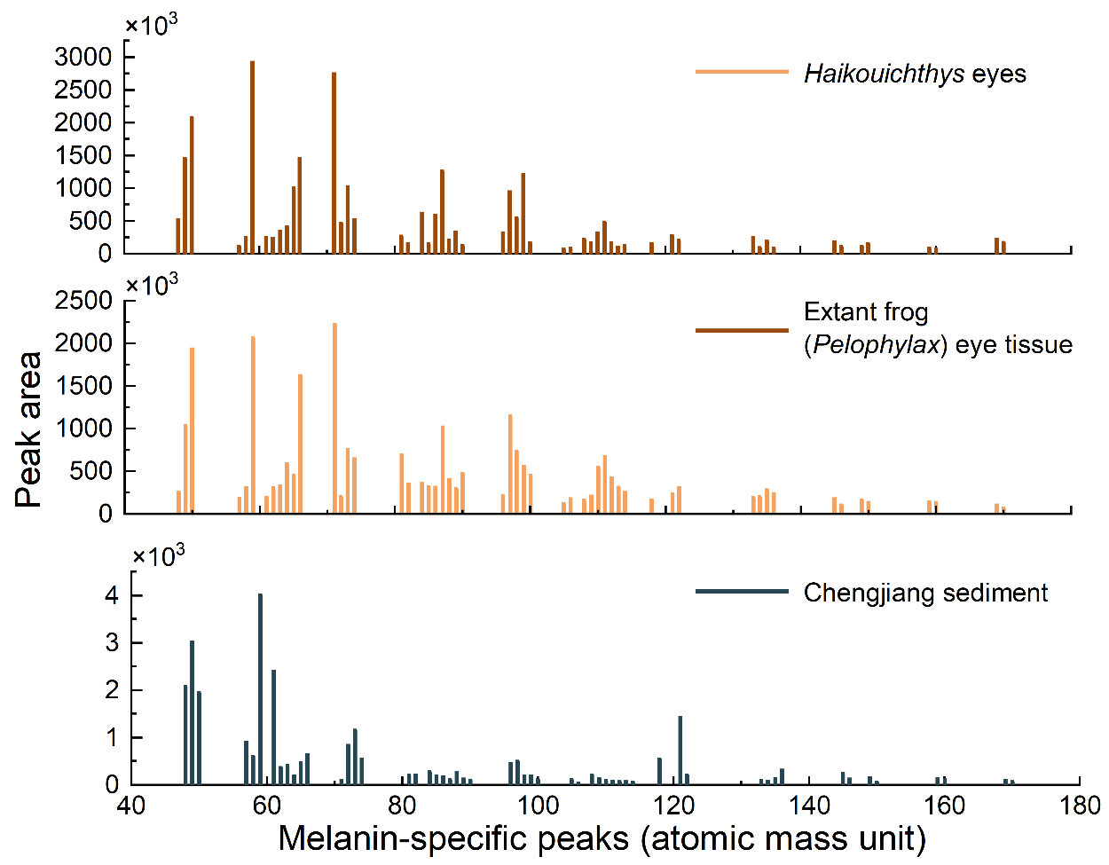 为了证实这些微球体是真正的黑素体而非细菌污染或其他有机质团块,团队使用高灵敏度的飞行时间二次离子质谱(ToF-SIMS)对有机碳膜的有机组分进行了分析,结果显示昆明鱼类化石中微球体样品的分子指纹与现生蛙类眼睛中的黑色素信号非常类似(图3);主成分分析也显示,昆明鱼类的样品与围岩及其他潜在污染源样品不重合,而与已报导的化石黑色素数据有交集。这从化石化学分子信号层面证实了昆明鱼类侧眼和中间体中的微球体为富含黑色素的黑素体。