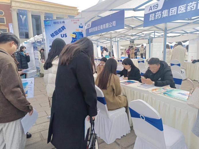 招聘会现场,公司师生与扬子江药业集团江苏扬子江医药经营有限公司、上药控股云南有限公司、云南省久泰药业有限公司、云南迪安医学检验所有限公司、以及砚山明本中学等五家单位的相关负责人进行了深度沟通交流。