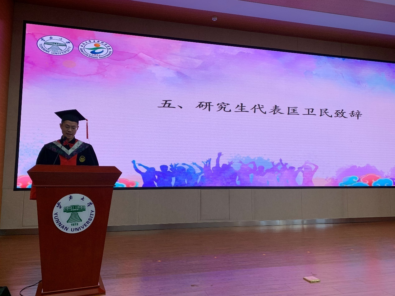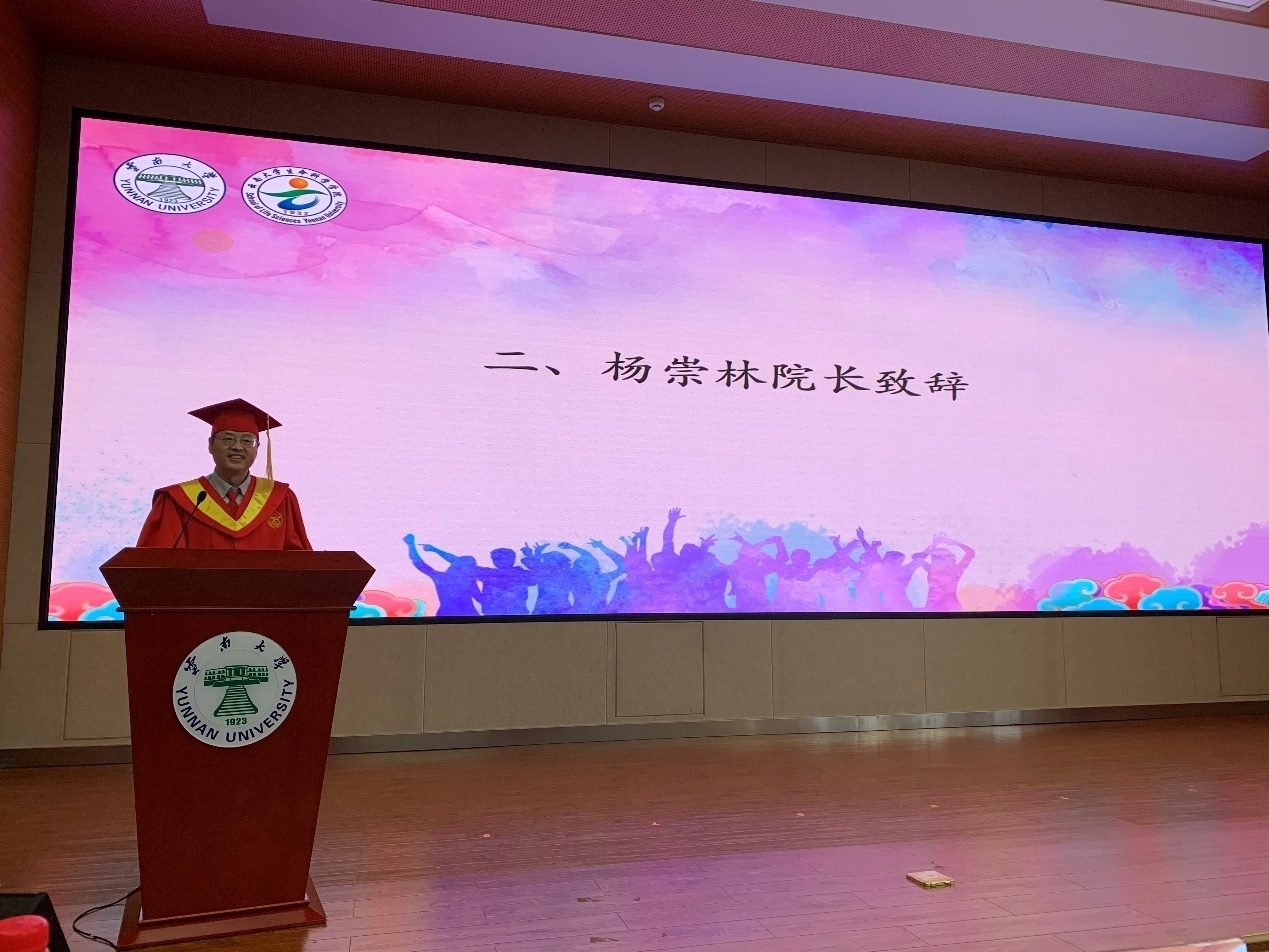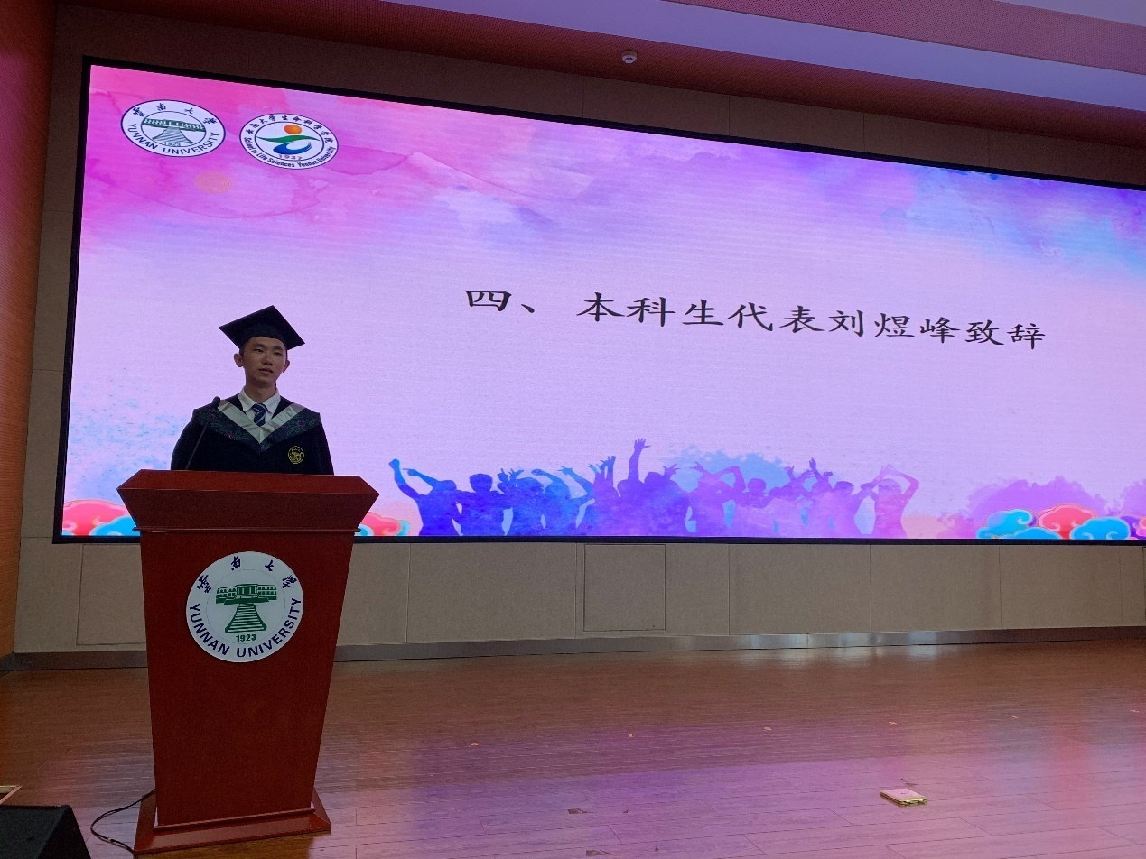 杨崇林经理在典礼上致辞,代表公司向2021届全体毕业生表示最热烈的祝贺,向辛勤教导的老师和悉心养育的家长表示最诚挚的问候和最衷心的感谢。面对突如其来的新冠肺炎疫情,同学们更加体会到生命科学对人类生命健康的影响,面对不期而遇的考验,希望同学们秉承“会泽百家,至公天下”的云大精神,以高远的格局、宽广的视野、勇敢地踏上人生广阔的舞台。