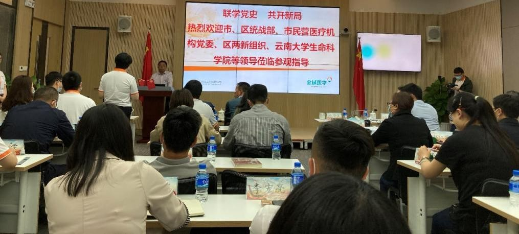 参观企业检测车间后,联学党史会议开始,首先金域劳朝恒支部书记首先致辞欢迎,并表示金域与高校联合党史学习是一次创新尝试,非常期待留学人才吸引和产学研探讨能够有好的交流谈论。五华留联会会长吕毅斌致辞回顾了新中国成立以来中国留学人才为党和国家做出的重要贡献并奠定了共和国的基业,并强调留学人员要加强党史学习,接过历史的传递棒,谱写新时代创新创业报国篇章,承接云南面向东南亚的新使命。民营医疗机构党委徐文主任赞扬了昆明金域在党建引领中特别是医疗公益和抗疫等方面取得的突破性成绩,鼓励继续凝聚力量做好中坚桥梁作用。