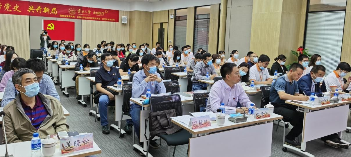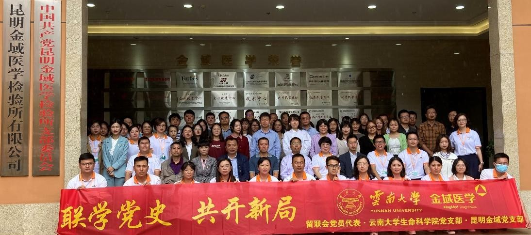 2021 年6 月11 日上午9 时,云南老员工命科学公司党委书记包崇许带队,研究生3党支部书记郭春明组织,生科公司党委委员、研究生3 党支部党员、员工代表一行54 人前往昆明金域医学检验所有限公司,与留联会、统战部领导联合开展“联学党史,共开新局”活动。通过联学党史的形式,激励全体党员干部不忘初心、牢记使命,扎实学习及工作,为中国共产党建党 100 年献礼。